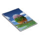 Quatre saisons apparaissent sur un arbre solitaire debout dans une prairie herbacée. Les branches supérieures sont nues et recouvertes de neige, laissant place aux fleurs roses, qui se transforment en feuilles vert foncé, qui tournent orange et or et tombent au sol. Au milieu des feuilles d'automne sur le sol sont des fleurs de printemps bleues et de la neige fondue.