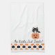 Cette adorable caractéristique "Pas de Trucs, juste des Traitements!" Assis à l'intérieur d'un citrouille sculpté est un chat noir et blanc. Sous le texte il y a un groupe blanc avec un motif citrouille noir et orange.