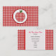 Un carte de visite comportant un arrière - plan rouge de guingan avec l'équilibre rose. Texte rouge et noir au-dessus de blanc pur. Personnalisez avec votre information. Caractéristiques de bord opposé assortissant l'arrière - plan de guingan. La pomme assortie de guingan à l'intérieur du cercle a formé le cadre rouge.
