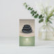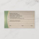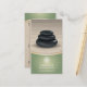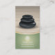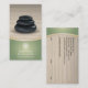 Ce carte de visite de spa exsude la sérénité. Trois pierres de massage sont empilées sur une surface en bois propre coordonnant avec un panneau incurvé de vert sauge ci-dessous. La raison sociale est augmentée par un ornement du soleil avec un site Web ou un numéro de téléphone ci-dessous. Les panneaux en bois sont répétés sur l'inverse pour montrer toute l'information de contact plus un secteur pour des rappels de rendez-vous. L'ornement du soleil peut être remplacé par votre propre logo ou toute autre image si désiré. Disponible dans des couleurs alternatives avec les produits assortis.