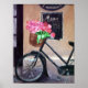 Ein originelles Gemälde eines französischen Landhauses. Ein Fahrrad mit einem Korb aus hellrosa Blume vor einem Restaurant.