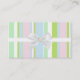 Ce joli carte de visite est parfait pour n'importe quelles affaires ou profession. Il comporte les rayures de vert, de rose, de bleu, et blanches sur l'avant. Un ruban et un arc courus par le centre. Un graphique d'une opale se repose au centre de l'arc. Le dos est un vert solide. Tout le texte est personnalisable.