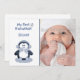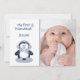 Célébrez le premier Hanoukka de bébé avec ce carte photo avec un mignon manchot habillé pour l'hiver en portant des bouffées d'oreilles et une écharpe bleues.