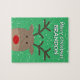 Le puzzle de Noël de l'enfant avec le mignon Rudolf le dessin animé de rennes de nez rouge. Design de vacances pour enfants en hiver coloré. Disponible en grandes et petites tailles. Un cadeau divertissant pour petits garçons et filles. Ajoutez votre propre nom personnalisé. Faites votre choix parmi les grandes et les petites pièces.
