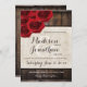 Le Faire-part de mariage Rustic Country Red Roses Modèle sur un arrière - plan en bois foncé avec des revêtements de linge de maison en linge usé. Il suffit de changer le libellé pour en faire le vôtre. Le haut est doté d'un bouquet de roses rouges en grappe dans le coin supérieur gauche du invitation. L'arrière du invitation a l'impression rustique de la grange en bois plus les roses rouges dans le coin inférieur avec le mot "Amour" en script. Imprimé sur votre choix de papier.