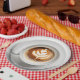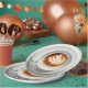 Leaf-Muster in Sahne, eine weiße Latte-Tasse auf einer weißen Untertasse, abgeschieden auf weiß