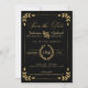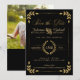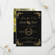 "Gold Laurel Leaf Greenery Black Save the Date Foto Verlobung Ankündigung." Feines, modernes und elegantes typografisches Format 5 x 7, in reich ebonischem Schwarz mit goldfarbenem Glitzer. Laubblätterecken und Lorbeer-Kranz. Das Foto der Verlobung wird mithilfe des vorgegebenen Vorlagenfelds einfach ausgetauscht. Kunst und Design von Audrey Jeanne Roberts, international lizenzierter Künstlerin, Urheberrecht.