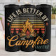 Diese einladende Grafik zeigt die Phrase "LIFE IST BESTER DURCH DAS Kampffeuer", umkreist um ein stilisiertes Feuer mit Stämmen und warmen Flammen. Der Hintergrund zeigt einen lebhaften, gestreiften Sonnenuntergang hinter silbernen Kiefern. Dieses Vintag inspirierte Design spiegelt den friedlichen Genuss und die natürliche Schönheit des Campings und der Entspannung im Freien perfekt wider.