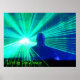 Ein DJ, der es auf den Decks mischt und von hinten mit Laserlicht badet.
