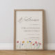 Dieses schlichte, moderne und lebendige Wildblume-Begrüßungsschild-Poster ist perfekt für Ihr "Ich do's", egal zu welcher Jahreszeit. Die eleganten Wildblumen in Abständen sind charmant und simpel, mit der gepflegten Touch mit Monogramm Braut- und Bräutigam-Initialen auf der Rückseite. Genießen Sie Ihre Hochzeit und begrüßen Sie Ihre Gäste im Frühling, Sommer, Herbst oder Winter mit unserem farbenfrohen und minimalistischen Design.