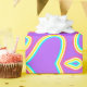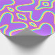 Ein sich wiederholendes, symmetrisches Muster in lila Farbtönen mit hellgelben, hellblauen und hellen aquamarinen Konturen, die einen 3D-Effekt erzeugen. Die Farbpalette ist lebendig und fröhlich, was ein spielerisches und etwas skurriles visuell macht. Die Wiederholung des Designs macht es scheinbar unendlich.