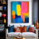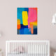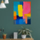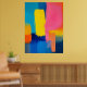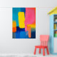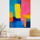 Kühne Schichten intensiver Farbblöcke schaffen eine abstrakte Landschaft, die vor Energie pulsiert. Blau, Rosa, Gelb und Orange interagieren in einer lebendigen und dynamischen Harmonie.
