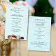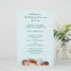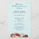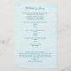 Hochzeitsprogramm für Lebende Meere, gedruckt auf bezahlbarem Papier. Passen Sie Text auf beiden Seiten über ein hellblaues Holzbild an. Auf der Vorderseite hat der Boden realistische Muscheln und einen Sand-Dollar. Text ist Tiefseeblau und wechselt zwischen Skript und gedruckten Schriftart. Auf der Rückseite ist Platz für eine kurze Nachricht des Paares. Das Papier hat eine Größe von 5,5 x 8,5.