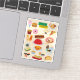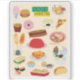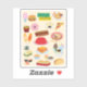 Ein Vektorbild verschiedener Lebensmittel wie Zuckerwatte, Hamburger, frittierte Garnelen, Gyoza, Pizza, Kartoffel-Fritten, Hotdog, Donut, Corndogs, Gelee, Ramen, Lasagne, Eisbecher, Eiscreme, Muffin, Nachos, Mochi, Sushi, Sandwich, Reisbällchen und Taco.