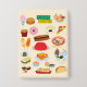 Ein Vektorbild verschiedener Lebensmittel wie Zuckerwatte, Hamburger, frittierte Garnelen, Gyoza, Pizza, Kartoffel-Fritten, Hotdog, Donut, Corndogs, Gelee, Ramen, Lasagne, Eisbecher, Eiscreme, Muffin, Nachos, Mochi, Sushi, Sandwich, Reisbällchen und Taco.