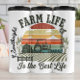 Das ist ein rustikales Grafikdesign mit einem Bauernthema. Das zentrale Bild zeigt einen klassischen Traktor, eine Scheune und eine Windmühle. Die Szene ist Set in einem gepflügten Feld gegen einen pulsierenden Sonnenuntergang mit Sonnenbrunnen in verschiedenen Farben. Die Phrasen "FARM LIFE" und "Is the Best Life" werden in einem kühlen, verwitterten Schriftart prominent über und unter der Szene dargestellt. Das Design ist unten durch einen Zaun mit dekorativen Weizenbündel eingeschlossen.