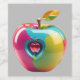Dieses Bild zeigt einen lebendig gefärbten, digital gerenderten Apfel, der eine Reihe von hellen, kontrastreichen Farben kombiniert. Der Apfel zeichnet sich durch eine glänzende Oberfläche mit glatter, reflektierender Oberfläche aus. In der Mitte des Apfels befindet sich ein gemeißelförmiger, herzförmiger Schnitt mit einem kleineren Apfelsymbol, der ein spielerisches, geschichtetes Design unterstreicht. Der Stamm des Apfels wird mit einer künstlerischen Kombination aus einem orangen und grünen Blatt überragt und verleiht dem Apfel eine zusätzliche Farbe und Kreativität.