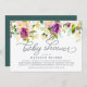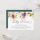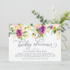 Moderne Aquarellblütendusche mit Blumen und Blütendusche, die mit dekorativen Typografie-Akzenten und rauchblauen grauen Schriftzeichen in violett lila, rot und grün besticht. Personalisieren Sie die Einladung mit der Babydusche mit den Vorlagenfeldern.