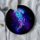 Große, blaue, künstlerisch gezeichnet, leuchtende, helle Quallen, mit langen Tentakeln auf schwarzem Hintergrund mit lila Biolumineszenz. Leuchtende Quallen.