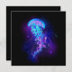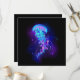 Große, blaue, künstlerisch gezeichnet, leuchtende, helle Quallen, mit langen Tentakeln auf schwarzem Hintergrund mit lila Biolumineszenz. Leuchtende Quallen.