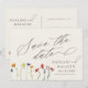 Diese einfache, moderne und lebendige Wildblume Hochzeit speichern das Datum Postcard ist absolut atemberaubend, egal zu welcher Jahreszeit. Die Wildblumen in eleganten Abständen sind charmant und simpel zugleich. Im Frühling, Sommer, Herbst oder Winter laden wir Sie mit unserem farbenfrohen und minimalen Save the Date Design ein.