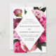 Elegante blumengeschmückte Einladungen mit Ihren Hochzeitsdetails in einem Diamantenrahmen, umgeben von wunderschönen, lebhaften rosa und rot rosafarbenen Pfannkuchen mit üppig grünen Blätter. Die Einladungen zur Pony-Hochzeit kehren zu einem hellrosa Hintergrund zurück, der Platz für zusätzlichen Text und Bilder bietet.