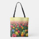 Feiern Sie Ostern mit diesem atemberaubenden Totenbeutel mit einem atemberaubenden Tulpenfeld, das mit lebendigen rot, gelb und orange Blüten und wunderschön dekorierten Ostereiern gefüllt ist. Ideal für Frühjahrsausflüge, Ostereinkäufe und festliche Geschenke!