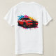 Klassischer roter Muskelwagen mit farbenprächtigem Farbspritzer-Hintergrund, der Lebhaftigkeit und Nostalgie anregt. Das Design hebt die eleganten Fahrzeugdetails und die künstlerische Kreativität hervor.
