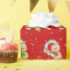 Niedliche Lebkuchen mit Süßspeisen in rot und grün Weihnachtsfarben auf rotem Hintergrund und Schneeflocken. Die Hintergrundfarbe kann geändert werden.