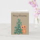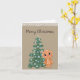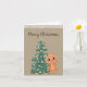 Lebkuchenmann mit Blue und Green Tree Card. Niedlicher Lebkuchenmensch mit den größten Augen und Lächeln, stehend neben einem blau und grün dekorierten Weihnachtsbaum. Bearbeiten Sie den Gruß und die Familiennamen nach Ihren eigenen Vorstellungen. Auf Wunsch können Sie die Farbe des Hintergrunds ändern, um die Gestaltung und den Stil Ihres Aufenthalts zu berücksichtigen.