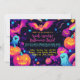 Dieses Halloween-Party lädt Sie zu einem zauberhaften und skurrilen Design ein, das klassische Halloween-Elemente mit lebendigen, magischen Touchs verbindet. Um den zentralen Text herum entsteht ein kreisförmiger Rahmen, der von bezaubernden, lächelnden Kürbissen, verspielten Geistern und einer niedlichen Fledermaus geschaffen wird. Zusätzlich zum Spaß kreisen die Regenbögen sanft durch den Hintergrund, und funkelnde Sterne blinken über die Szene hinweg, was eine zusätzliche Ebene der Verzauberung und Freude hinzufügt. Der Hintergrund bleibt ein kühnes Schwarz, was die hellen, lebhaften Farben - lebendige Regenbögen, Neonorangen, elektrische Purples und funkelnde Pinks - noch lebendiger erscheinen lässt. Die Regenbögen und Sterne verleihen den spöttischen Figuren eine traumhafte, magische Atmosphäre, was das Design sowohl festlich als auch bezaubernd macht. In der Mitte dieses spielerischen Rahmens lautet der zentrale Text: "BOOO! Du bist eingeladen zu einem Spook-takulären Halloween-Bash! Einladung" in einem fröhlichen, skurrilen Schriftart. Die glitzernden Sterne und Regenbogen um die Geister, Kürbisse und Fledermäuse bringen eine Touch von Magie und Wunder in die Einladung, die perfekt für die Erregung eines Halloween-Party für Kinder. Die Rückseite der Einladung setzt sich fort mit dem schwarzen Hintergrund und einer Streuung von Sternen und Regenbögen, verlassend Platz für UAWG Details oder zusätzlichen Text. Dieses Design verbindet das Beste von Halloween-Leckerbissen mit einer pulsierenden, magischen Drehung, die es perfekt macht für ein lustiges und bezauberndes Halloween-Fest.