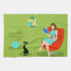 Cette serviette de cuisine pour femme de lecture rétro présente un style années 60, art minimaliste, dessin animé d'une femme qui a ses priorités dans l'ordre. Ce délicieux ver de livres est entrainé dans un vrai tourneur de page. La brunette, toute en forme, porte une robe d'aqua et des lunettes rouges, tout en tenant un livre bleu. Elle est assise dans une chaise confortable aux oeufs rouges. Devant elle, un chat noir élégant dans un col turquoise profite de la tranquillité qui vient de vivre avec un bibliophile. Femme et chat sont tous deux dans une élégante chambre verte. Au-dessus, une lampe pendentif kitsch dans les tons jaune et turquoise. Sur le côté, un plante luxuriant, tropical, en pots, est installé dans un pot à fleurs d'aqua. Kitty, si vous avez besoin de quelque chose, vous devrez attendre jusqu'à ce qu'elle finisse ce chapitre !