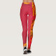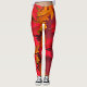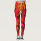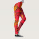 Une paire de jambes portant des leggings avec un arrière - plan rouge et des feuilles rouges et oranges, et des baskets noirs et blancs.