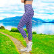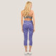 Grandes leggings Capri pour dames dans une grille de carrés alternatifs, chacun contenant une forme irrégulière dans une teinte contrastée. Violet et bleu.