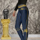 Une luxueuse paire de leggings rayés noir et bleu avec ornements dorés des chaînes de mode.