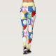 These leggings burst with playful, modern energy thanks to their bold patchwork design. Each square and rectangle features its own vibrant motif—tulip-like florals, diamonds, stars, circles, and stylized leaves—creating a lively mosaic of color and pattern. The palette mixes saturated reds, yellows, greens, blues, pinks, and crisp white, giving the piece a cheerful, retro‑meets‑modern vibe.