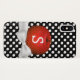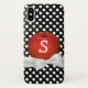 Hübscher iPhone X Gehäuse mit einer Grafik einer kleinen Blume auf saftigem Rot, vor einem schwarz-weißen Polka Punkt Hintergrund. Die Grafik eines weißen Bandes und Bogens läuft über den Grund des Apfels. Personalisieren Sie das Monogramm mit einem weißen Buchstaben. Ideal für sich selbst oder als Geschenkidee für Ihren Lieblingslehrer.