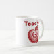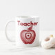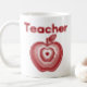 Ein modernes Lehrerdessin mit einem geschichteten roten Apfel mit konzentrischen Ringdetails und einem fetten Lehrertitel in roter Typografie. Die zentrierte Komposition erzeugt einen ruhigen, ausgeglichenen Look, der auf einem weißen Becher hervorsticht. Ein gedachtes Geschenk für Erzieher, neue Absolventen oder jeden, der auf den Lehrerberuf stolz ist