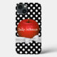 Hübsches iPhone Gehäuse mit einer kleinen Blume auf saftigem Rot, auf schwarz-weißem Polka Dot Hintergrund. Die Grafik eines weißen Bandes und Bogens läuft über den Grund des Apfels. Personalisieren Sie den weißen Text. Ideal für sich selbst oder als Geschenkidee für Ihren Lieblingslehrer.