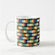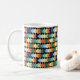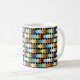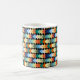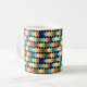 Diese Tasse hat ein geometrisches Design von hellen Diamanten, die sich auf einem schwarzen Feld überlagern.