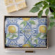 Fügen Sie Ihrer Verpackung eine Touch mediterranen Charme hinzu mit unserem Lemon Azulejo Tiles Pattern Tissue Paper! Inspiriert durch traditionelle portugiesische Azulejo-Fliesen, zeichnet sich dieses lebendige Muster durch hellgelbe Zitronen vor einem geometrisch-blauen Hintergrund aus.