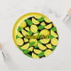 Vorderseite: Lemonscheiben und Blätter. Nahtloses Muster. Benutzerdefinierte Hintergrundfarbe. Eigener Text. Hinterseite: Runder Teil Zitronenhintergrund. Benutzerdefinierte Textfelder für Ereignisinformationen