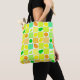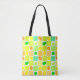 A fun tote with a colorful citrus fruit pattern of lemons, limes, oranges and citrus slices on squares of white, orange, teal and yellow.
