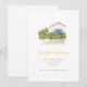 Eine charmante neue Adresse/neue Zuhause-Ankündigung mit einer Aquarelldarstellung eines weißen und blauen Bungalow-Hauses mit Zitronenbäumen und einem weißen Zaun.