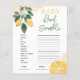 Lemon Word Scramble Baby Shower Game hat eine zarte Drehung zu Ihrer Babydusche mit unserem Lemon Word Scramble Baby Shower Game, eine lustige und einnehmende Aktivität, die Ihre Gäste erfreuen wird! In diesem lebhaften Spiel werden die Gäste eine Liste von Wörtern mit Babycharakter mit einem erfrischenden Zitronenmotiv entpacken. Es ist ein Wettlauf gegen die Uhr zu sehen, wer die kürzesten Wörter in der Zeit herausfinden kann! Mit lebendigen Zitronenillustrationen und einem frischen, Zitrusgrün inspirierten Design sorgen unsere Spielkarten für einen farbenfrohen und unterhaltsamen Abend. Die fröhlichen, gelben Akzente und spielerischen Schriftart machen dieses Spiel zu einer angenehmen Ergänzung zu einer Babydusche. Mit unserem Lemon Word Scramble Baby Shower Game können Sie Ihre Feier mit einem Hauch von Spaß und Spannung bereichern, was es zu einem unvergesslichen Ereignis für die Mama-to-be und all Ihre Gäste macht. Lass, dass das Entwirren beginnt!