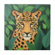 Keramik-Kachel in einem Leopard mit hellen, intensiven Augen, die durch üppiges grünes Blattwerk gucken. Der scharfe Kontrast zwischen dem gepunkteten Pelz des Leoparden und den lebhaften Blätter schafft einen auffallenden visuellen Effekt.