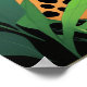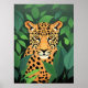 Drucken Sie in einem Leopard mit hellen, intensiven Augen, die durch üppiges grünes Laub schrecken. Der scharfe Kontrast zwischen dem gepunkteten Pelz des Leoparden und den lebhaften Blätter schafft einen auffallenden visuellen Effekt.