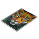 Auffallendes und hochdetailliertes Portrait eines Leoparden. Sein Gesicht dominiert die Komposition und zeigt lebendiges orangefarbenes Fell mit schwarzen Flecken. Die Augen des Leoparden sind ein intensives Smaragdgrün, das sofortige Aufmerksamkeit zeichne. Die Umgebung ist von üppiger Vegetation und Blätter umgeben, was die wilde und lebendige Atmosphäre des Stückes unterstreicht. Die Gesamtkunst betont die Schönheit und Majestät des Leoparden und schafft so eine faszinierende und kraftvolle Präsenz.