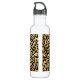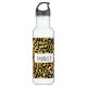 Wasserflasche mit einem stilvollen Muster. Exotische schwarze Leoparden auf einem goldenen Hintergrund. Wilder und dennoch eleganter Stil. Ein weißer Rechteck mit einem Imitat mit goldenen Rahmen, der oben mit dem personalisierten Text überlagert ist.
