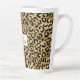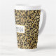 Eine latte Tasse mit einem stilvollen Muster. Exotische schwarze Leoparden auf einem goldenen Hintergrund. Wilder und dennoch eleganter Stil. Ein weißer Rechteckrahmen mit einer goldenen Folie in Imitaten, die oben mit dem personalisierten Text überlagert ist.